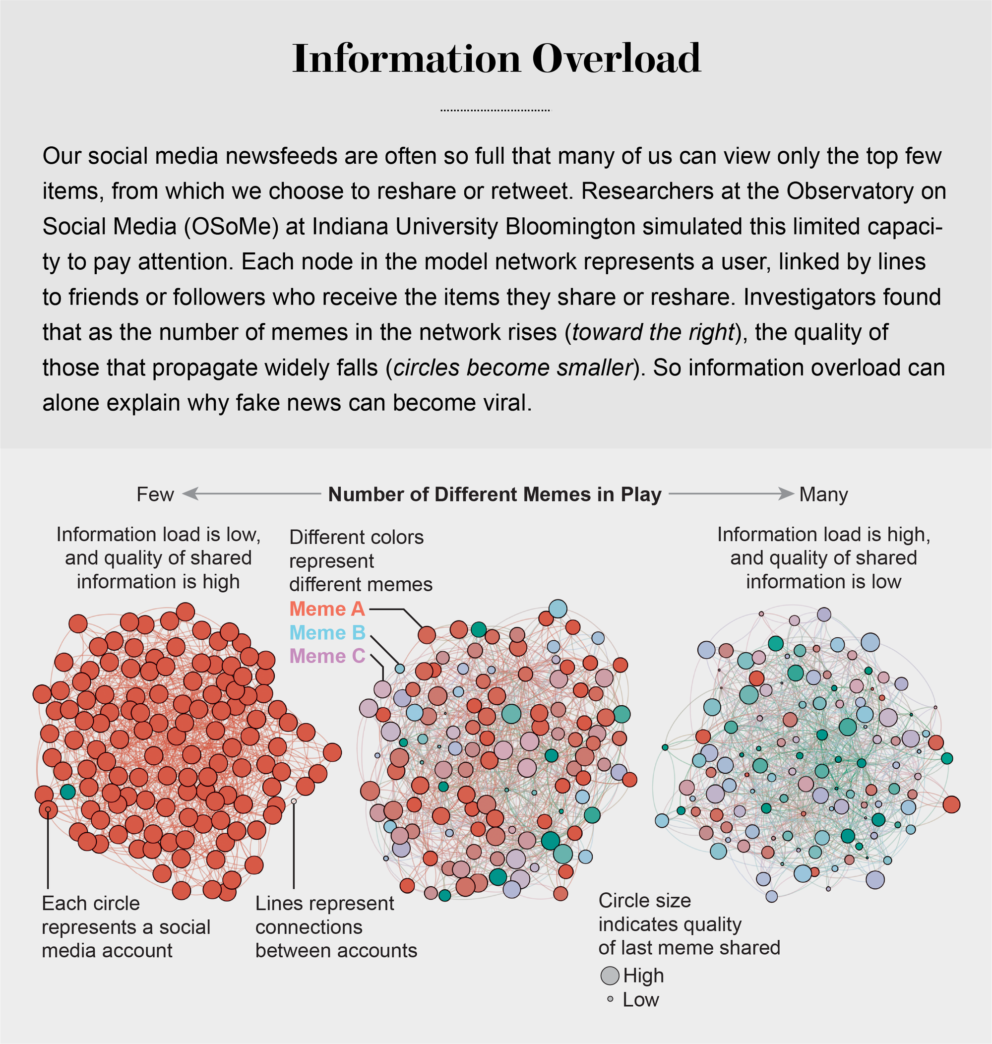 This winner-take-all popularity pattern of memes, in which most are barely noticed while a few spread widely, could not be explained by some of them being more catchy or somehow more valuable: the memes in this simulated world had no intrinsic quality. Virality resulted purely from the statistical consequences of information proliferation in a social network of agents with limited attention. Even when agents preferentially shared memes of higher quality, researcher Xiaoyan Qiu, then at OSoMe, observed little improvement in the overall quality of those shared the most. Our models revealed that even when we want to see and share high-quality information, our inability to view everything in our news feeds inevitably leads us to share things that are partly or completely untrue.