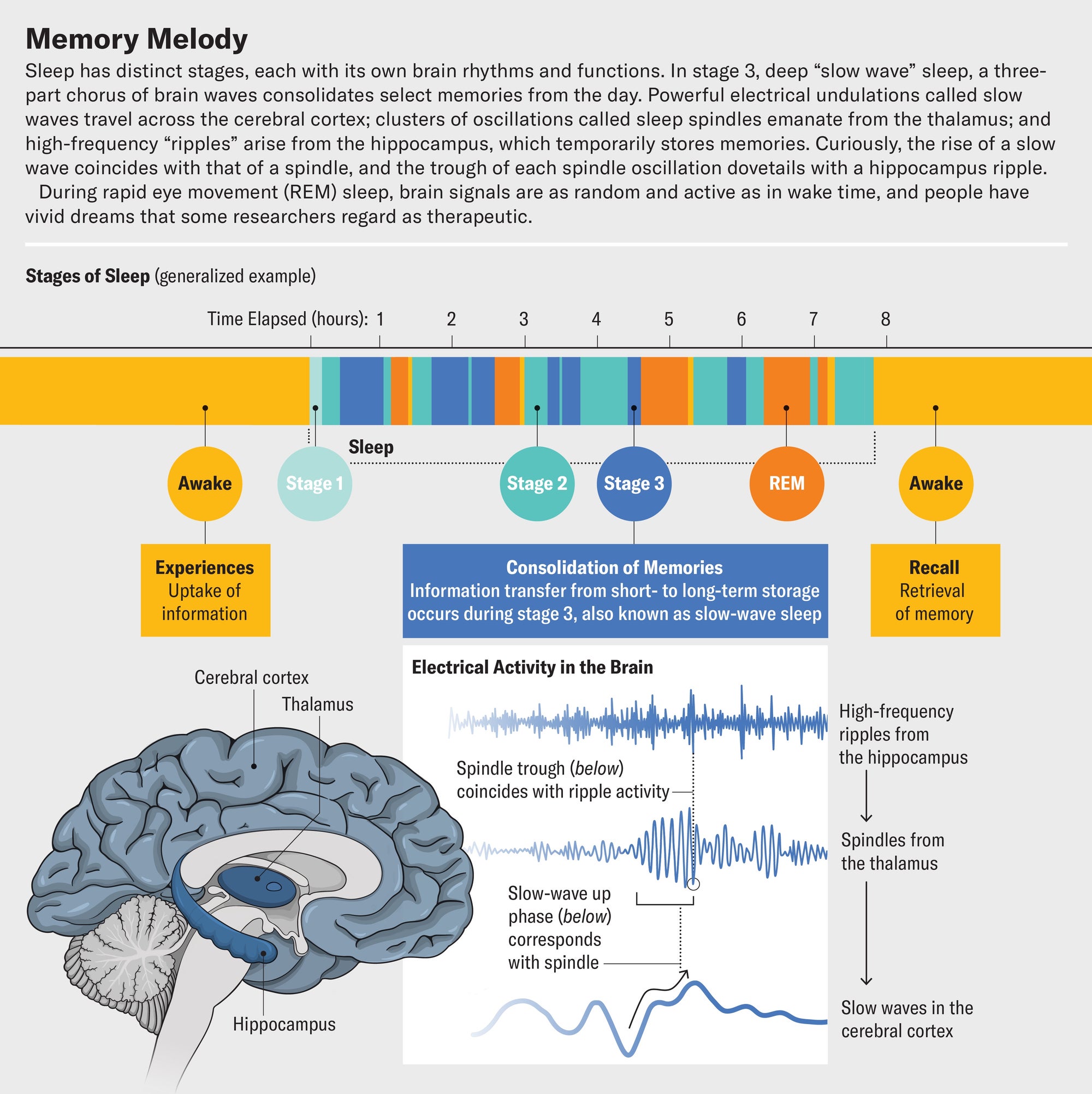 In a further, striking coincidence—or more likely not a coincidence at all but something integral to a process of nightly information transfer perfected by evolution—both the ripples and the spindles rise and fall with the slow waves. “There's this three-part symphony,” Stickgold says. “The hippocampus and the thalamus and the cortex all work in unison to strengthen specific memories.”