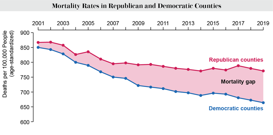 A key takeaway from these studies is that the partisan mortality gap doesn’t have to keep growing. “As a public health expert and as a physician, it doesn’t matter to me whether my patient is a Republican or Democrat,” Warraich says. “I want the best outcome for both of those patients and both of those communities.” Acknowledging the mortality gap, as challenging as that is in our polarized environment, is the first step toward engaging with solutions, he says. “The worst thing that could happen is that [the BMJ study] just becomes labeled as political or partisan,” he says—“and that the people who really need to look at these findings ignore it because it is providing a truth that is uncomfortable or difficult to interpret.”