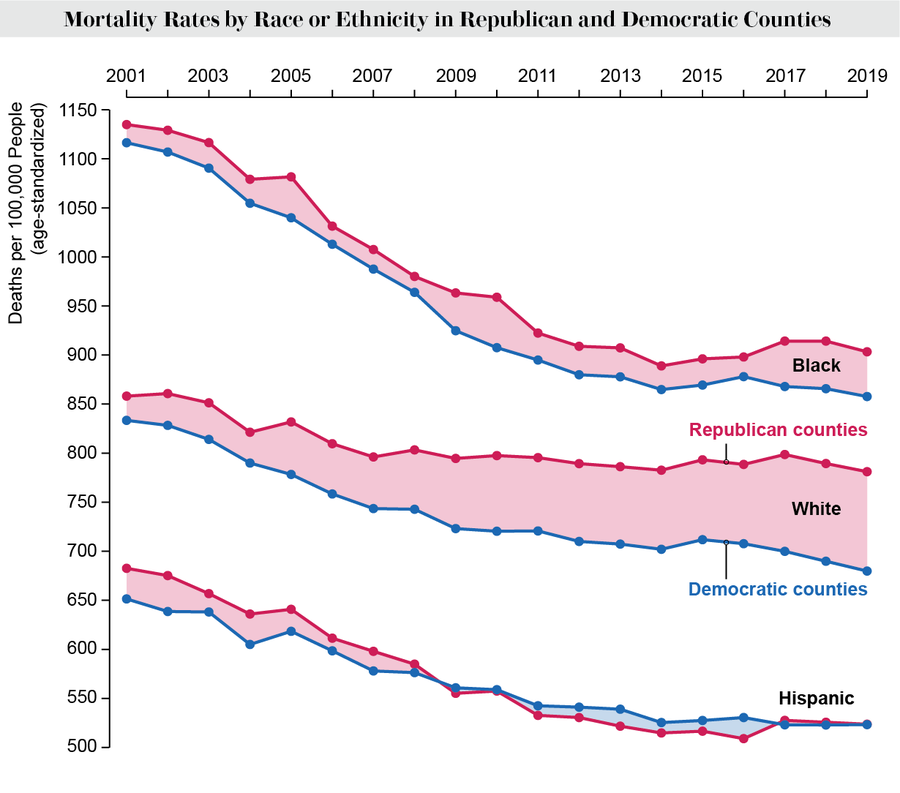 And an analysis of the new study’s data by subgroups supports the idea that individual choices play a role. Hispanic Americans everywhere saw significant improvements in their risk of death. Black Americans still have the highest mortality rates of any racial group, but they saw relatively similar improvement. “It didn’t really matter where they lived,” Warraich says. For white Americans, however, the difference was profound—a fourfold increase in the mortality gap between those living in Republican and Democratic areas.