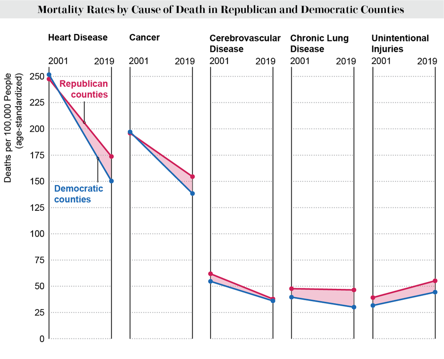 The new study, conducted by researchers in Texas, Missouri, Massachusetts and Pakistan, covers the years 2001 through 2019 and examines age-adjusted mortality rates—the number of deaths per 100,000 people each year—from the top 10 leading causes of death, as recorded in 2019. These include heart disease, cancer, lung disease, unintentional injuries and suicide. The researchers then analyzed county-level results in each of the five presidential elections that took place during their study period, identifying counties as Republican or Democratic for the subsequent four years. They found the gap in mortality rates between Republican and Democratic counties increased for nine out of 10 causes of death. (The gap for cerebrovascular disease, which includes stroke and aneurysms, remained but narrowed.) Political environment, the authors suggest in the paper, is a “core determinant of health.”