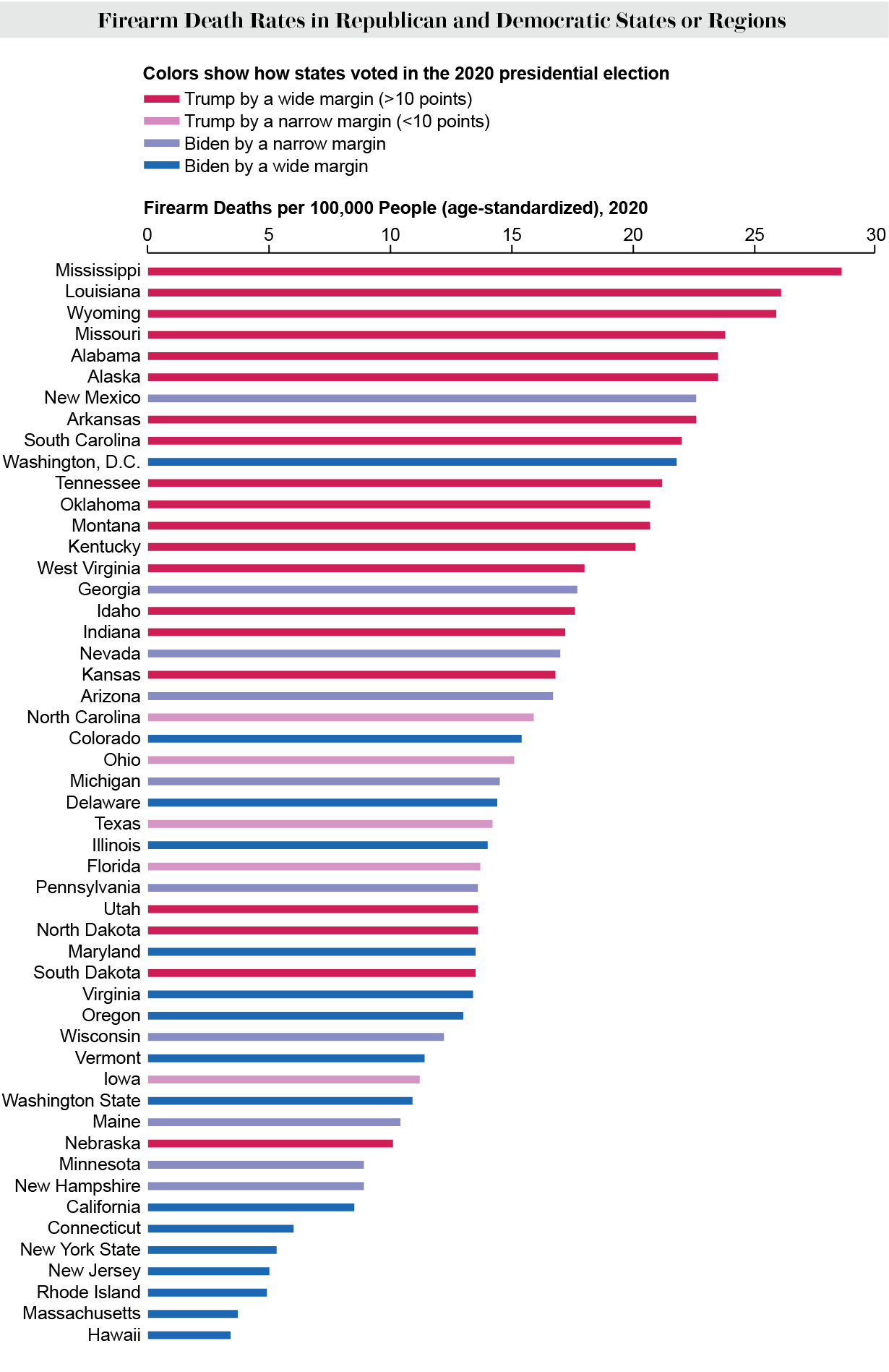 As with COVID, the divergence between states over gun safety laws is dramatic. Firearms contribute to deaths from suicide and unintentional injury and to many nonlethal injuries. Blue states are more likely to require background checks, whereas red states more often allow concealed carry of guns. With gun laws, too, researchers are beginning to look at the effects of policies in aggregate, says Garen Wintemute, emergency physician and director of the Violence Prevention Research Program at the University of California, Davis. “Before California enacted a suite of laws regulating firearms and their ownership and use in the late 1980s and early 1990s, firearm violence mortality rates here were higher than in the rest of the country,” he says. “After those laws were enacted, rates plummeted in California.” The most likely explanation, which Wintemute hopes to test, is that the laws were in part responsible. Until recently, that kind of research has been severely curtailed by the Dickey Amendment, a 1996 addition to a federal spending bill that effectively prevented the Centers for Disease Control and Prevention from conducting research on firearm violence. Congress clarified the law in 2018, paving the way for research funding. “Things are modestly looking up,” Wintemute says. “The CDC and [National Institutes of Health] both have small amounts of research funding and are using it.”