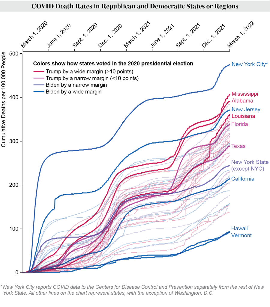 During the COVID-19 pandemic, the link between politics and health became glaringly obvious. Democrat-leaning “blue” states were more likely to enact mask requirements and vaccine and social distancing mandates. Republican-leaning “red” states were much more resistant to health measures. The consequences of those differences emerged by the end of 2020, when rates of hospitalization and death from COVID rose in conservative counties and dropped in liberal ones. That divergence continued through 2021, when vaccines became widely available. And although the highly transmissible Omicron variant narrowed the gap in infection rates, hospitalization and death rates, which are dramatically reduced by vaccines, remain higher in Republican-leaning parts of the country.